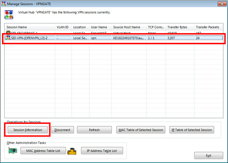 You can browse the list of current active VPN guest session by opening the "VPNGATE" virtual hub.